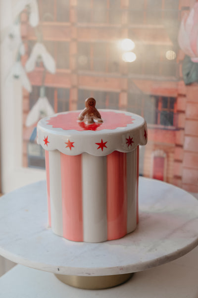 Whether its for your christmas cookies or for your bedside best bits, this gingerbread jar will be a cute festive addition. The ceramic jar features pink and white stripes with a scalloped lid with stars and a gingerbread man.