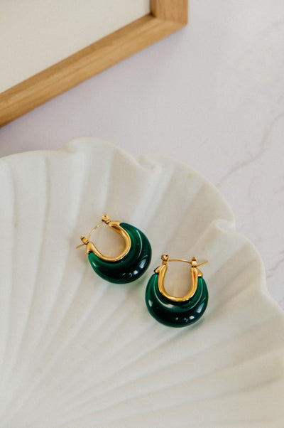 In a rich shade of green and with elements of gold, the Arin Oval Hoop Earrings makes for an elegant addition to your accessories collection. Whether it's with an evening dress or jeans and white tee this colour combo will work with just about any look.
