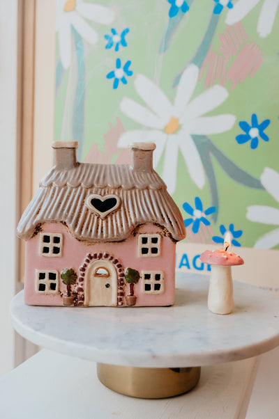 The pink cottage cabin features green trees and a rustic finish. Place an incense cone in the back and get cosy with 2 smoking chimneys.  Select to add 2 x incense cones.