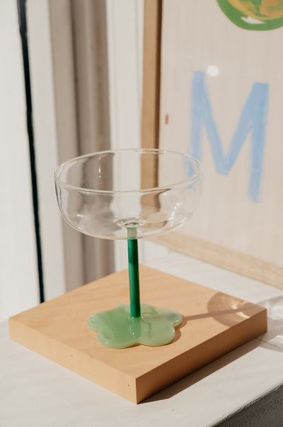Staying-in Sats are where it's at with the Elise Jade Green and Sage Green Flower Coupe Cocktail Glass . The clear coupe glass features a milky white rim, jade green steam and a contrasting sage green flower base. A retro style glass that will be sure to impress your guests and make for a statement bar cart addition.