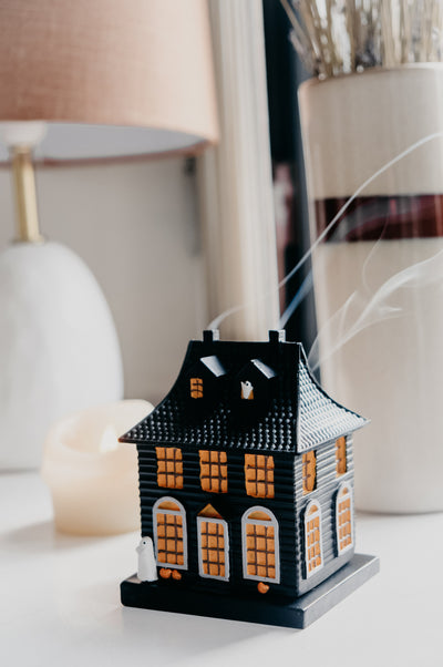 Welcome to the spookiest house in the neighbourhood. All black throughout with glowing windows and ghost accents, this house knows how to decorate for halloween night.  Place an incense cone inside and let the chimneys smoke away.