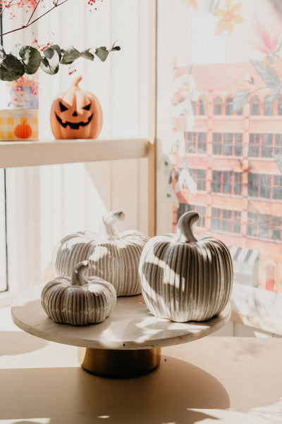 Minimal autumn vibes with the Jayne Rustic Ribbed Pumpkins. Whether together or as standalone piece the ribbed styles features a  rustic finish. Select from 3 sizes - sold individually.