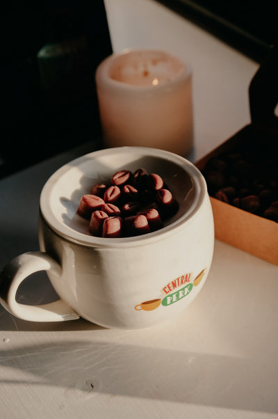 Mornings always start at the Perk! Get cosy with our coffee cup shaped melt burner that has an interchangeable incense burner top. Place a tealight in the back and pair with our bean shaped melts for the perfect coffee effect or opt for Rachels First Paycheck that melts to lilac glitter. Melts and incense cones sold separately.