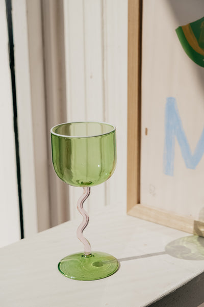 Clink, clink in a Yana Green and Pink Swirl Cocktail Glass! The swirl glass shape features clear green glass, a pink swirl stem and is complete with a milky white rim. A retro style glass that will be sure to impress your guests and make for a statement bar cart addition.