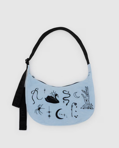 A cute crescent shape that will fit perfectly under your arm. The baby blue bag features icons such as a spider, bow, crescent moon and a swan.