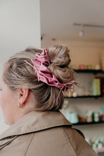 Ballet vibes all over with the Eliana Rose Pink Large Silk Hair Scrunchie . Made from silk, the rose pink base features pretty little bows.