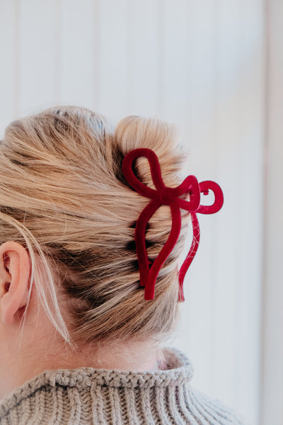 The Erin Red Velvet Bow Claw Clip will be a pretty and practical addition to your hair accessory collection. Not only will this claw clip look cute on your dresser, the acetate style features a secure crocodile snap closure making it the perfect hair accessory for all hair type. Sold individually.
