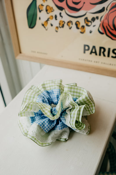Frankie XL Blue Gingham and Green Trim Scrunchie