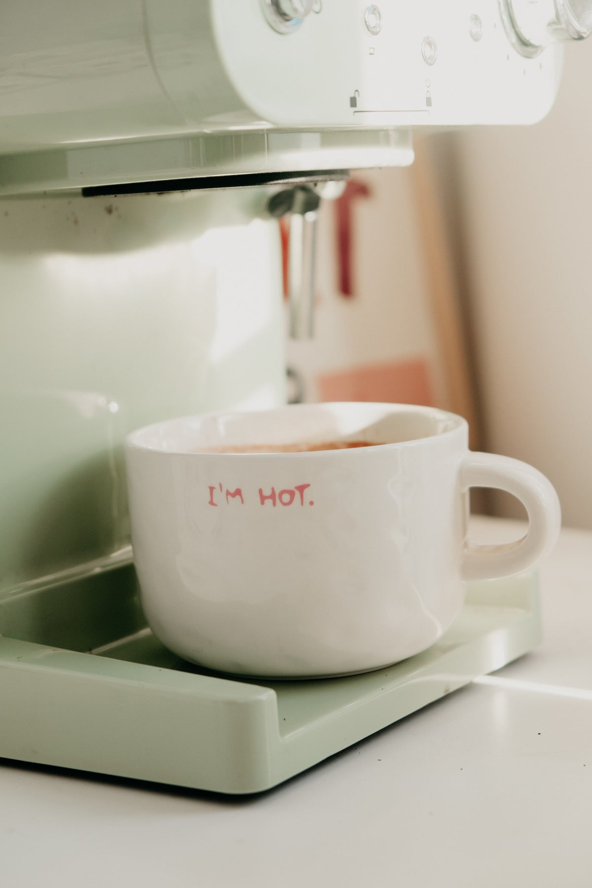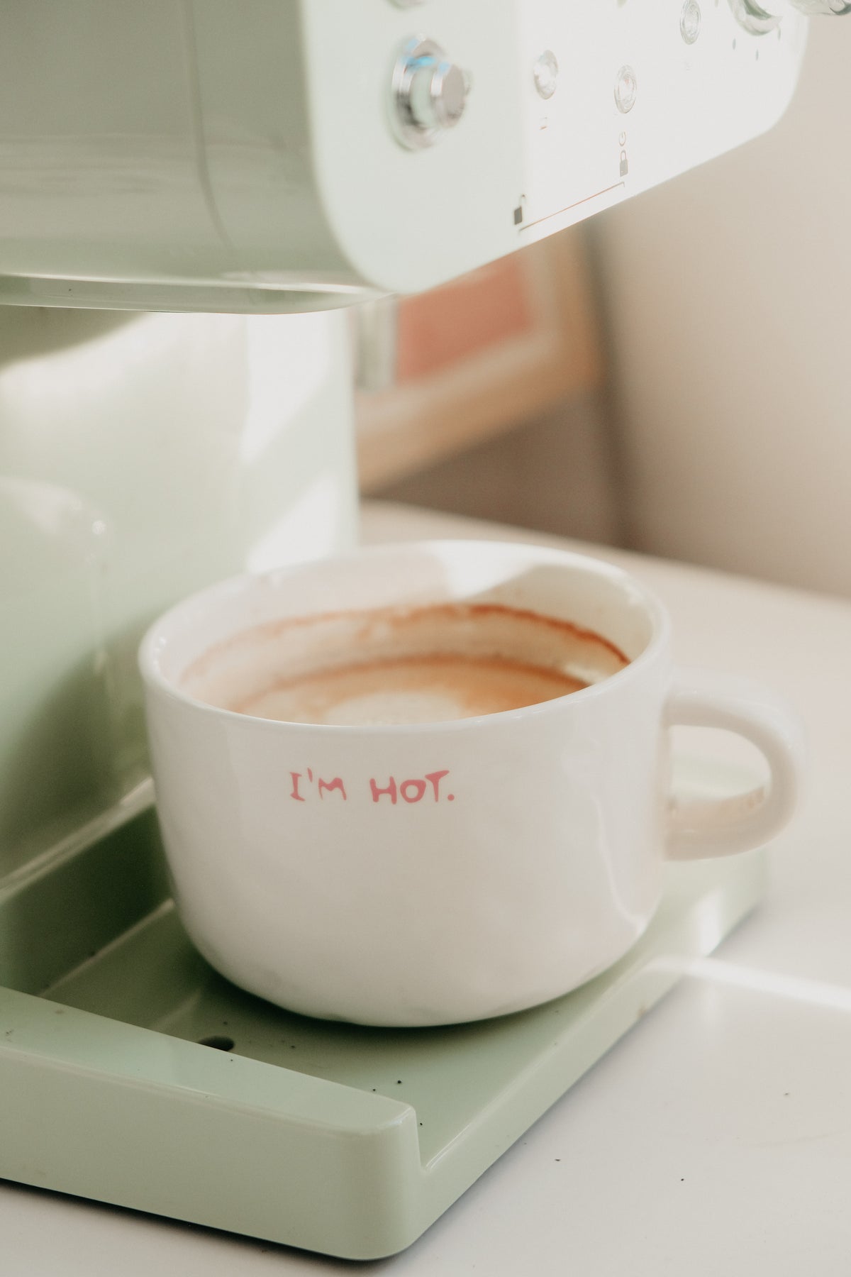 Extra hot and with an extra shot. In a neutral glaze the mug features a handpainted slogan 'im hot’. Finished in a lightly hammered style and a round handle (yes, we can confirm it's super easy to hold!). Sold individually.