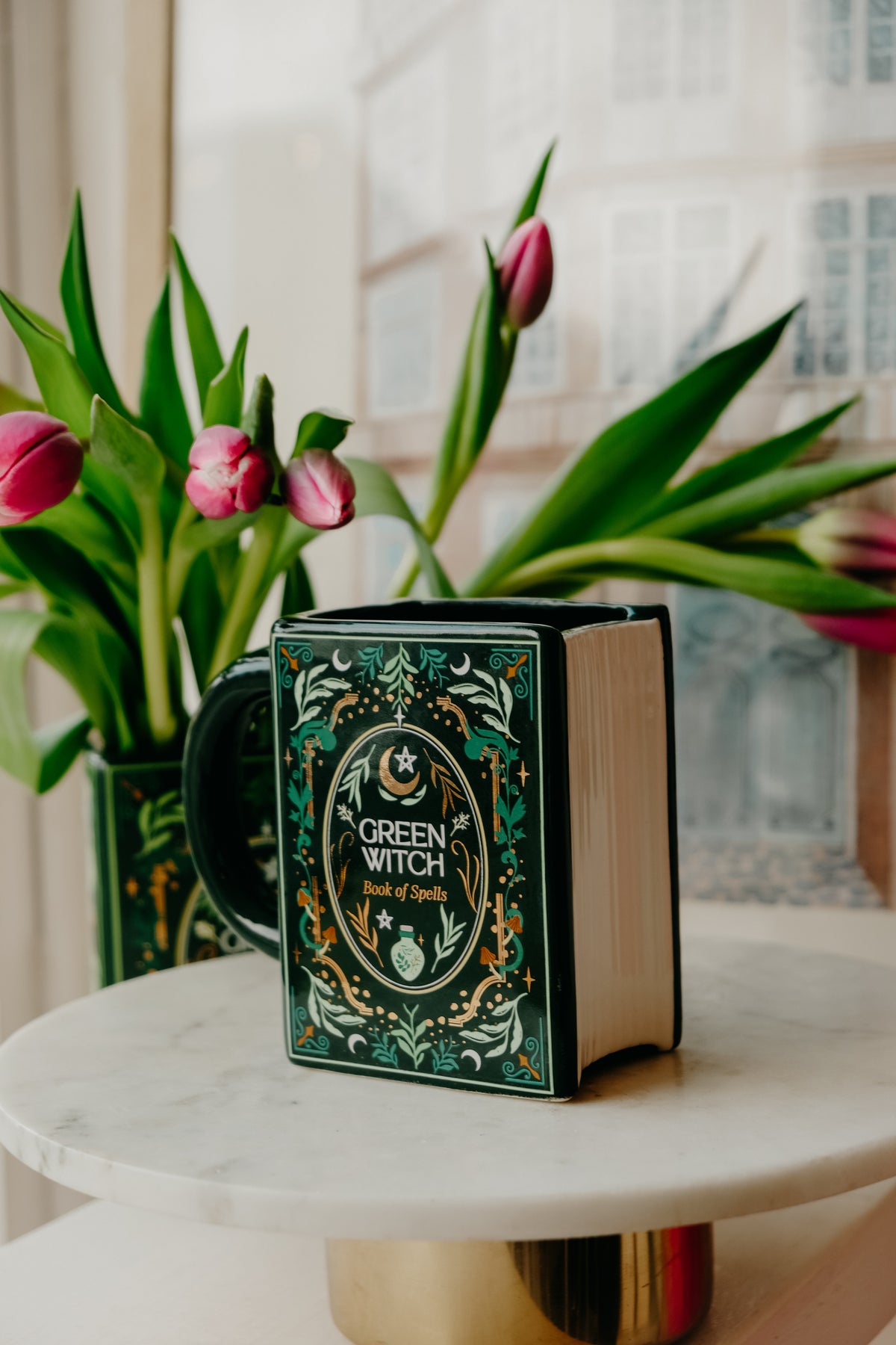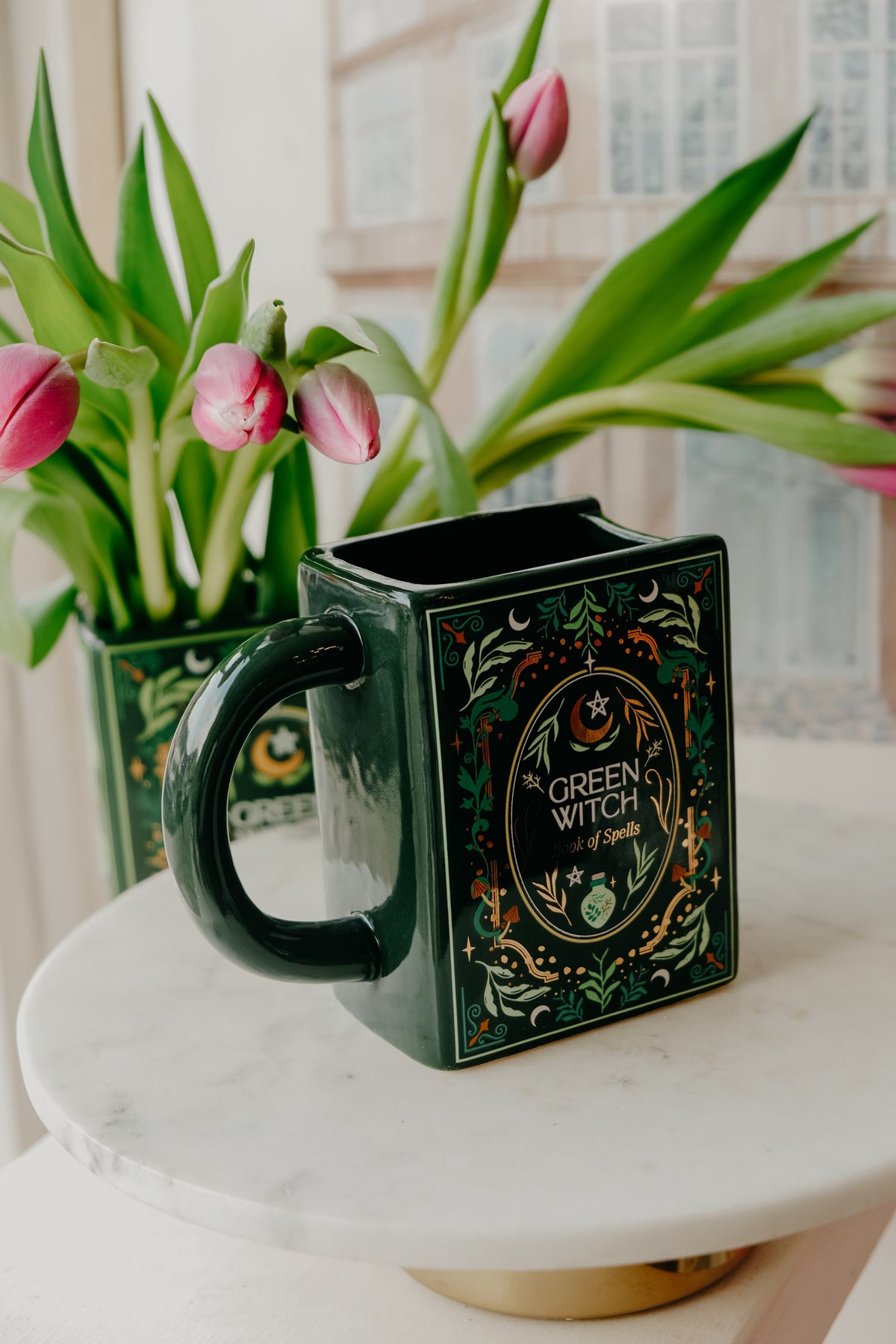 Magical morning is complete with the Spring Witch Book Mug. The rich green green book shaped coffee mug features a witchy aesthetic style design.