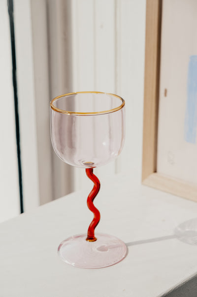 Clink, clink in a Yana Pink and Amber Swirl Cocktail Glass! The swirl glass shape features clear pinkglass, a amber swirl stem and is complete with a milky white rim.